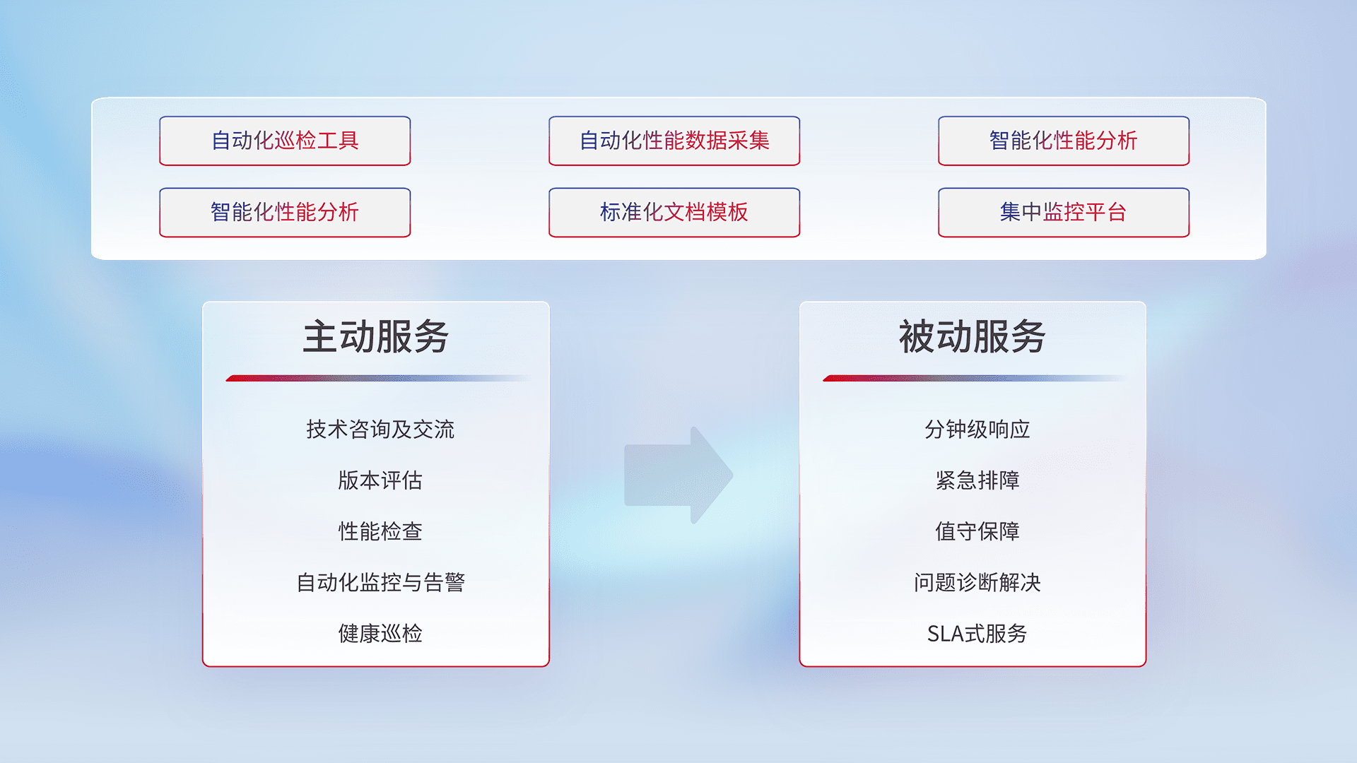 智能化工具和标准化文档,,,保障服务质量,,提供主动服务(包含技术咨询、、版本评估、、、、性能检查、、、自动化监控与告警、、健康巡检)和被动服务包含(分钟级响应、、、紧急排障、、、值守保障、、、、问题诊断解决、、、SLA服务)。。。