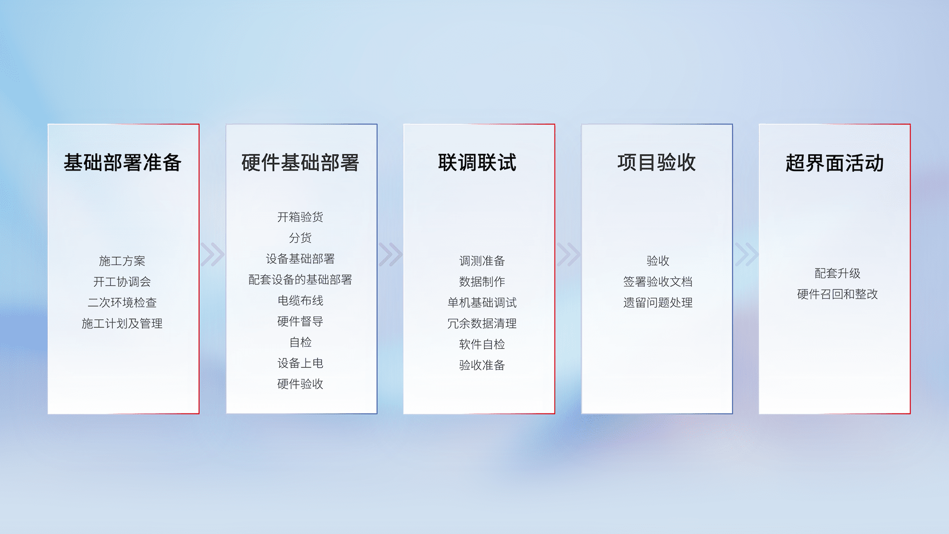 从基础部署准备、、、硬件基础部署、、、、联调联试、、、项目验收、、、越界面活动的全过程可追溯,,保证施工质量和进度。。